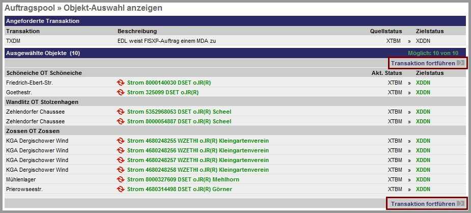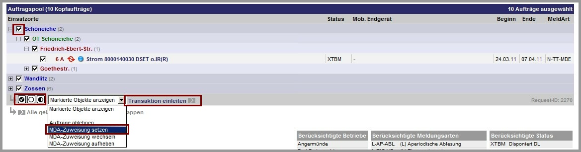 Öffnen Sie die Drop-Down-Liste und wählen Sie die Transaktion MDA-Zuweisung setzen aus. Klicken Sie auf Transaktion einleiten. Nachdem Sie die Transaktion eingeleitet haben, öffnet sich in einem neuen Fenster eine Übersicht Ihrer Objekt-Auswahl.