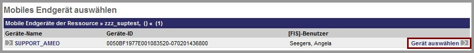 Nach Fortführung der Transaktion öffnet sich in einem neuen Fenster das Menü "Mobiles Endgerät auswählen". Hier werden Ihnen die für die Zuweisung möglichen mobilen Geräte mit Angabe des Geräte-Namens, der Geräte-ID und des [FIS]-Benutzers aufgelistet (siehe folgende Abbildung).