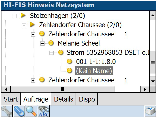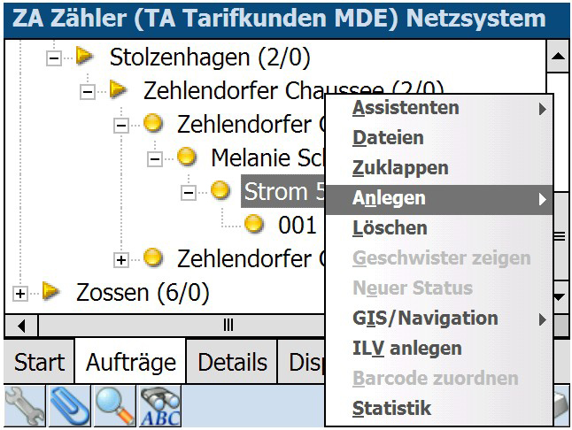 Markieren Sie hierzu in der Registerkarte Aufträge den Teilauftrag ZA Zähler (z. B. Strom 5352968053 DSET o.IR(R) Scheel) und drücken Sie solange mit dem Stift darauf bis ein gepunkteter Kreis erscheint.