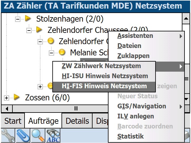 In der Registerkarte Aufträge wird ein HI-FIS Hinweis Netzsystem angelegt (linke untere Abbildung). Wechseln Sie in die Registerkarte Details und hinterlegen Sie im Feld "HI Neuer Hinweis" z. B. die Telefonnummer des Hausmeister oder einer anderen Kontaktperson, so dass bei einem Wechsel des Ablesers auch der neue Ableser alle nötigen Informationen hat (rechte untere Abbildung).